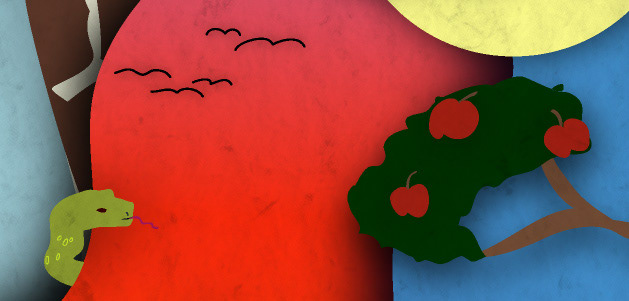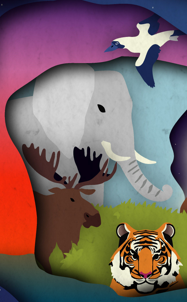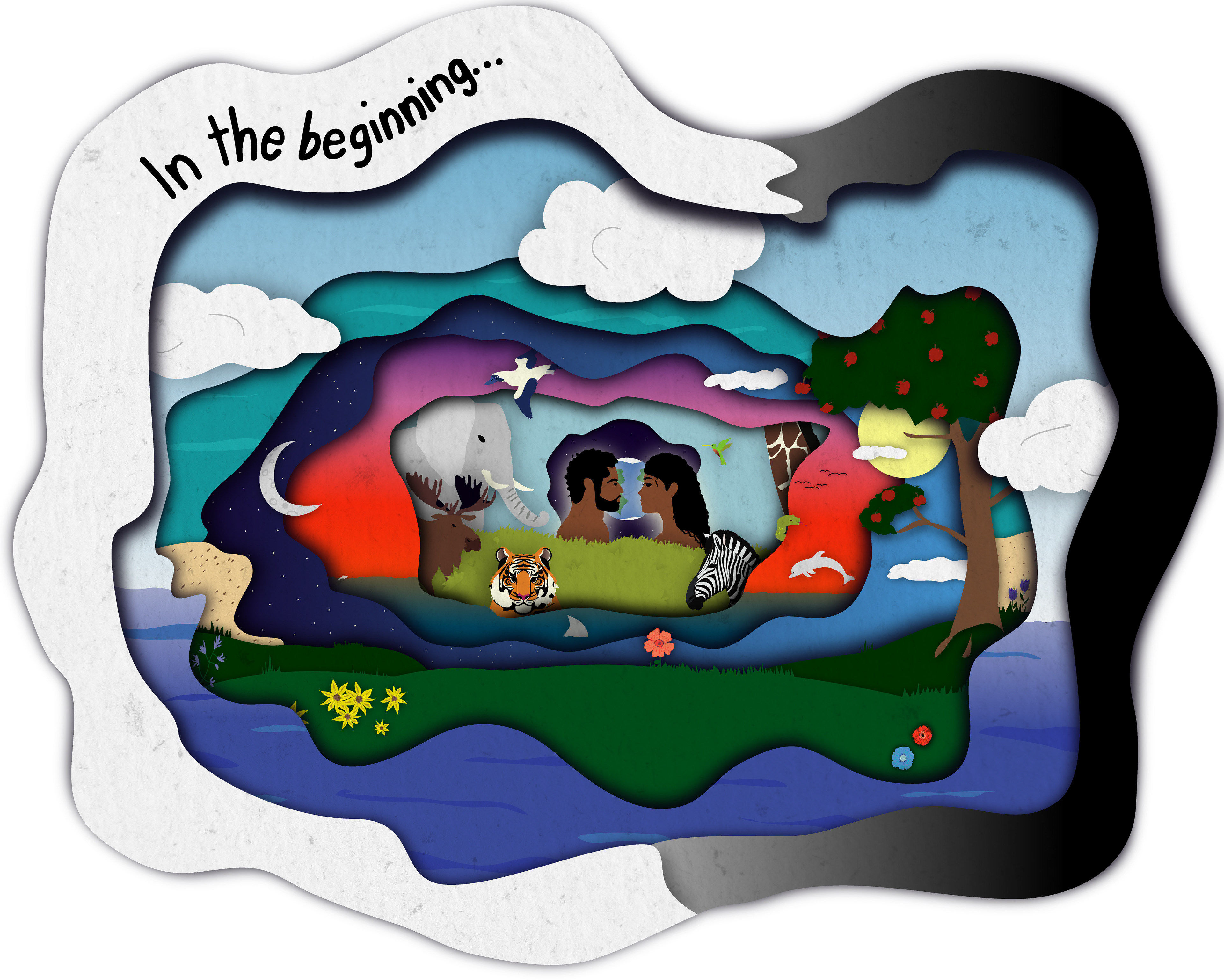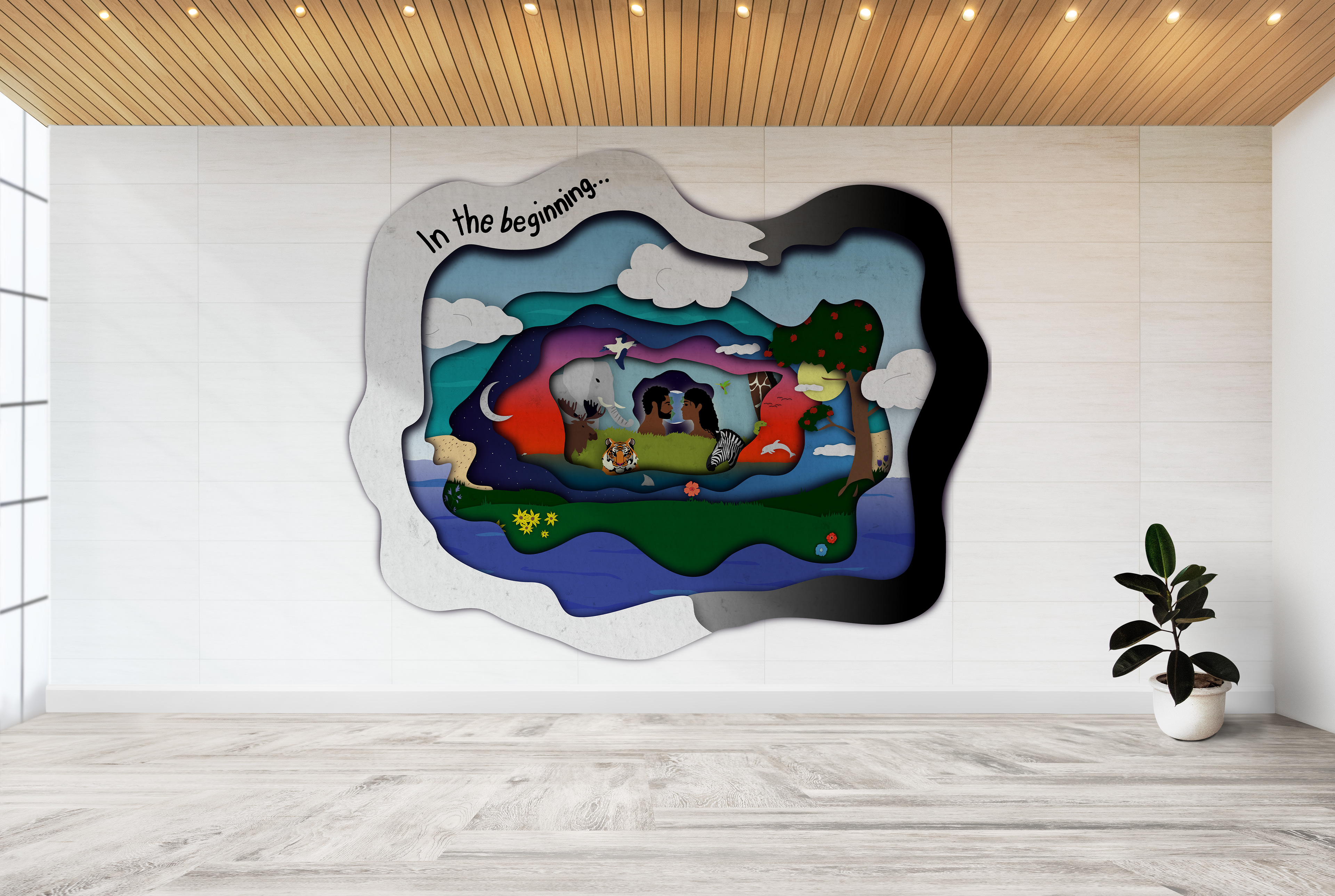 This mural is done in the style of a shadowbox with each layer being a different day of creation. Each day is cascading towards the center with Adam and Eve as well as the completed world.
